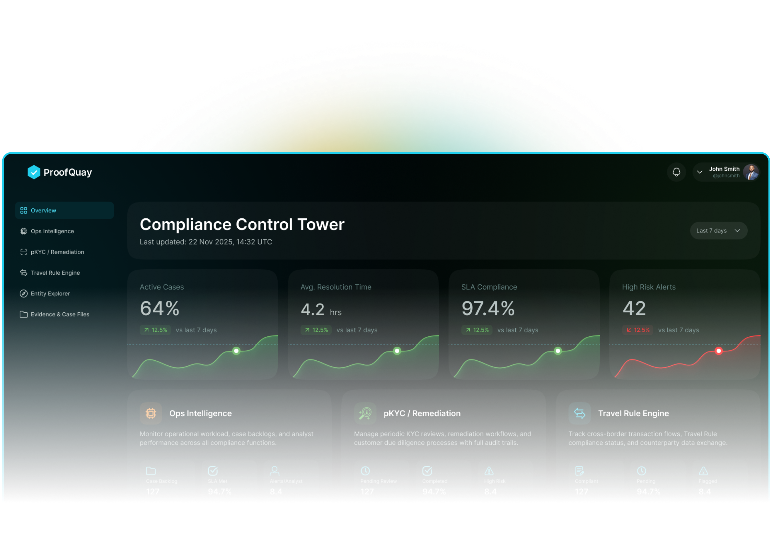 One screen for case backlog, SLA pressure, risk hotspots, and team queues. Turn compliance chaos into predictable ops.