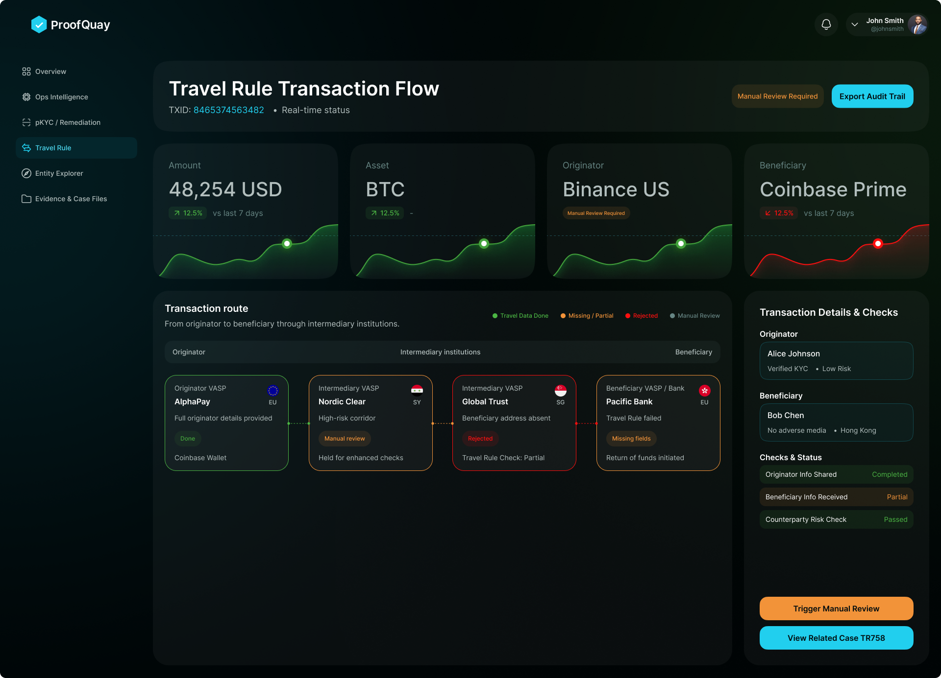 Track cross-border transaction flows, Travel Rule compliance status, and counterparty data exchange.
